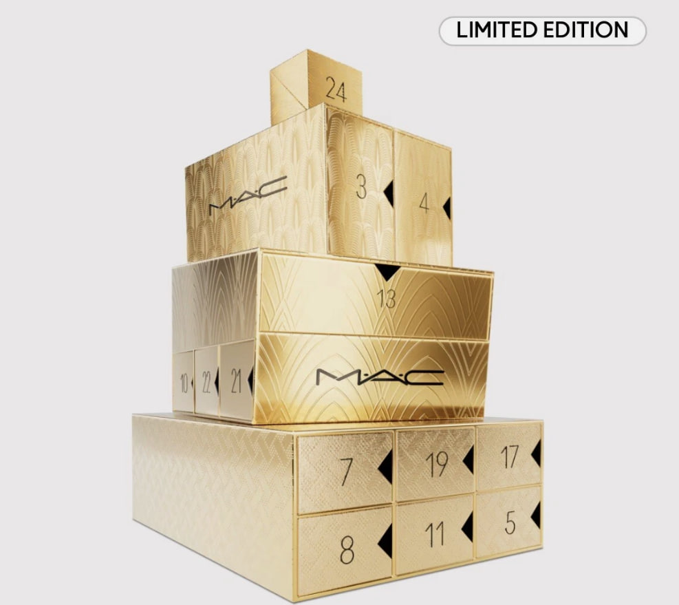 The calendar has 24 drawers, elegantly stacked in a tiered, shiny gold “gift box” design—making it a festive decor piece as well as a beauty gift.